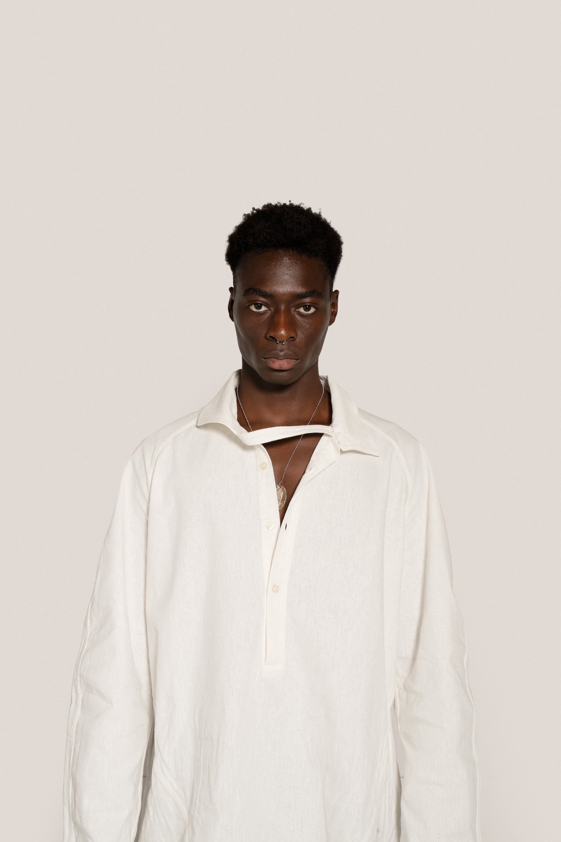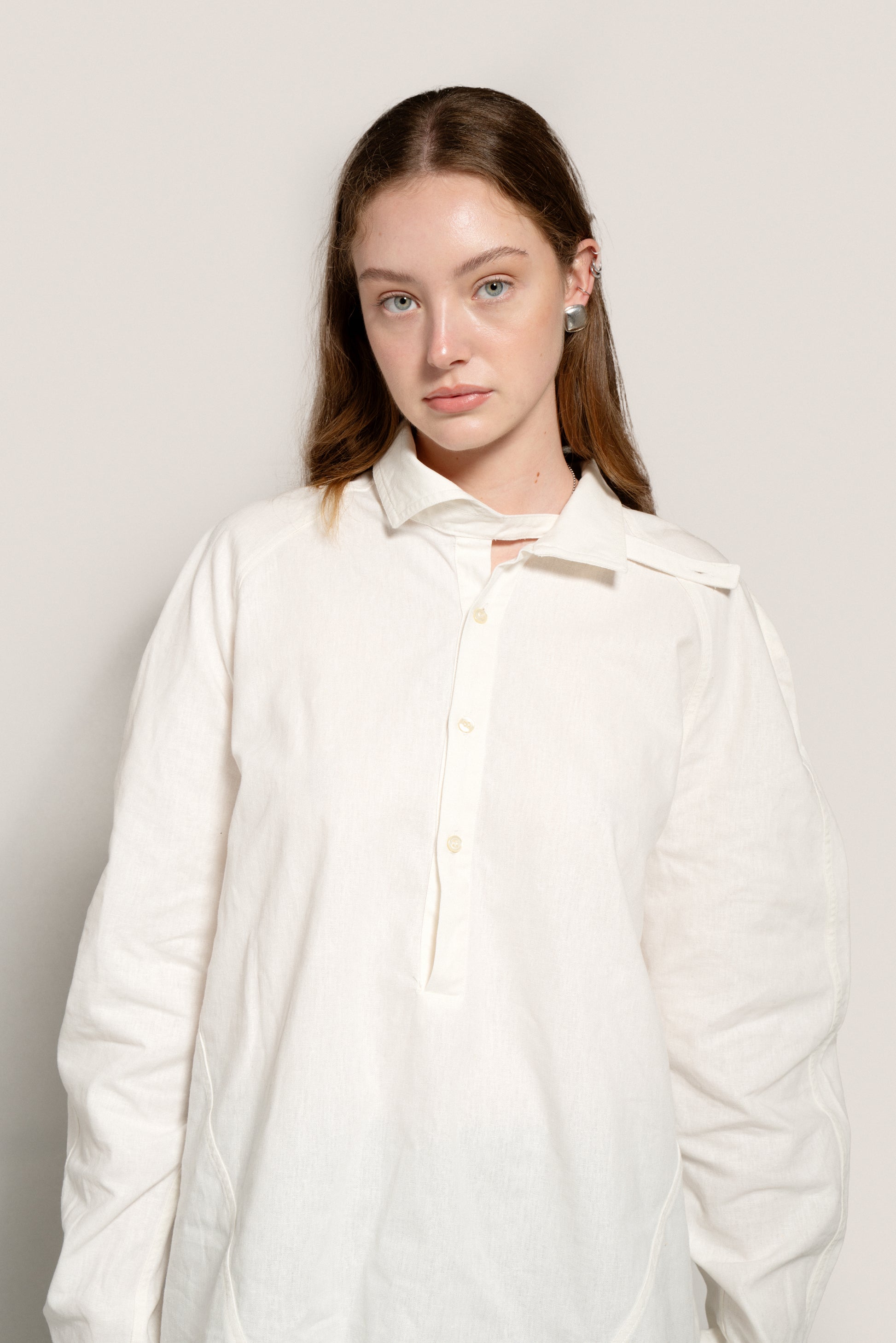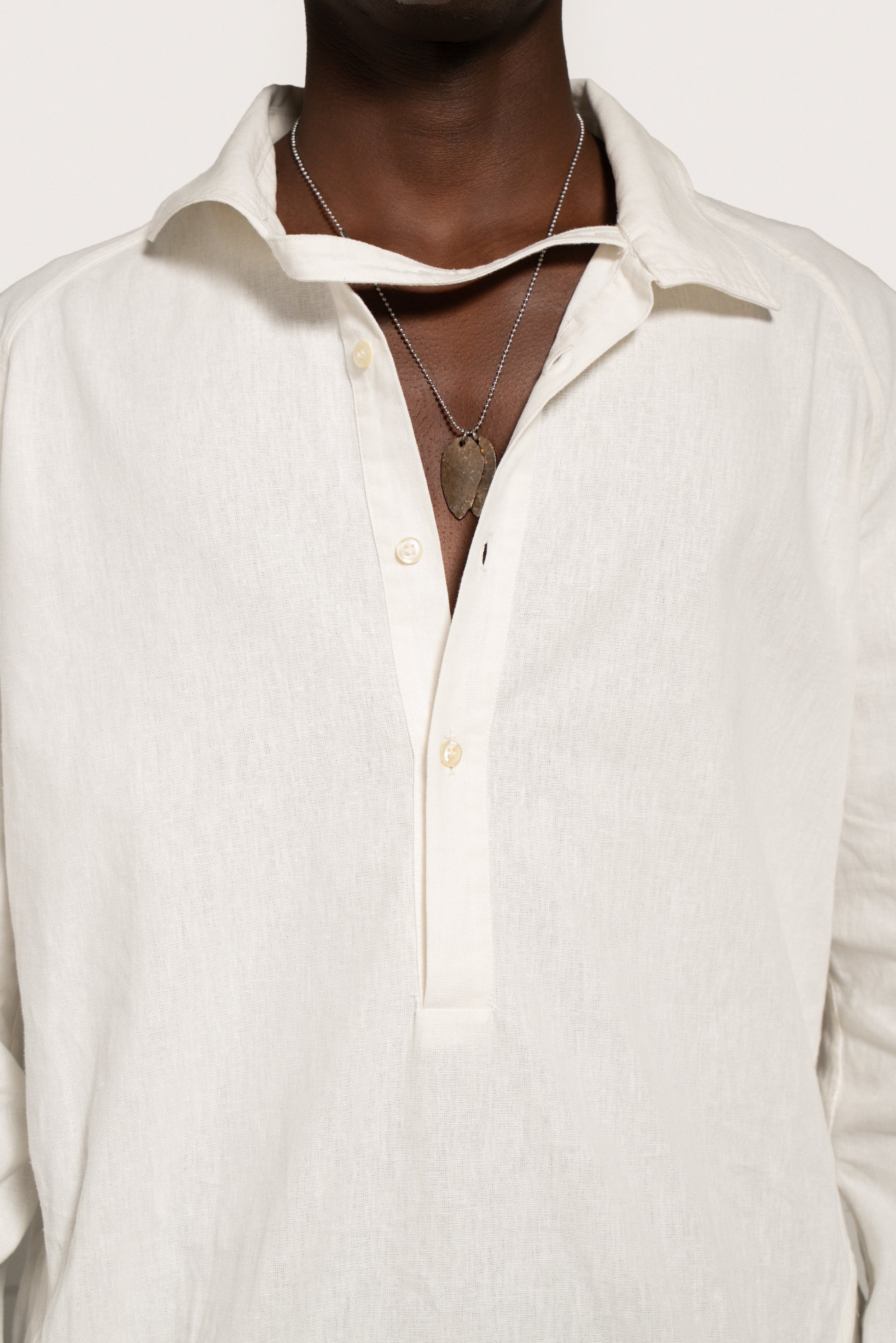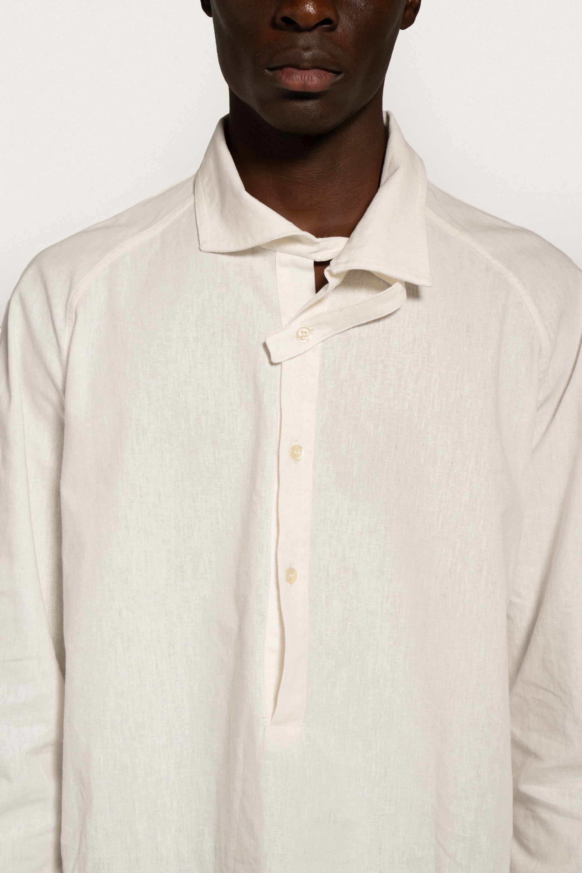 Loose-fitting, straight-cut linen and cotton shirt. It features a raglan cut at the front and a classic armhole at the back, accompanied by a yoke cut that blocks a pleat at the center back. Stainless steel plate on the back. Asymmetrical collar with three-button polo fastening at the center front. The right strap is extended to allow for different fastening options, while the left round neck has a loop that allows the strap to pass through. There are two buttonholes and two buttons at the bottom of the sleeve to adjust the width of the sleeve.