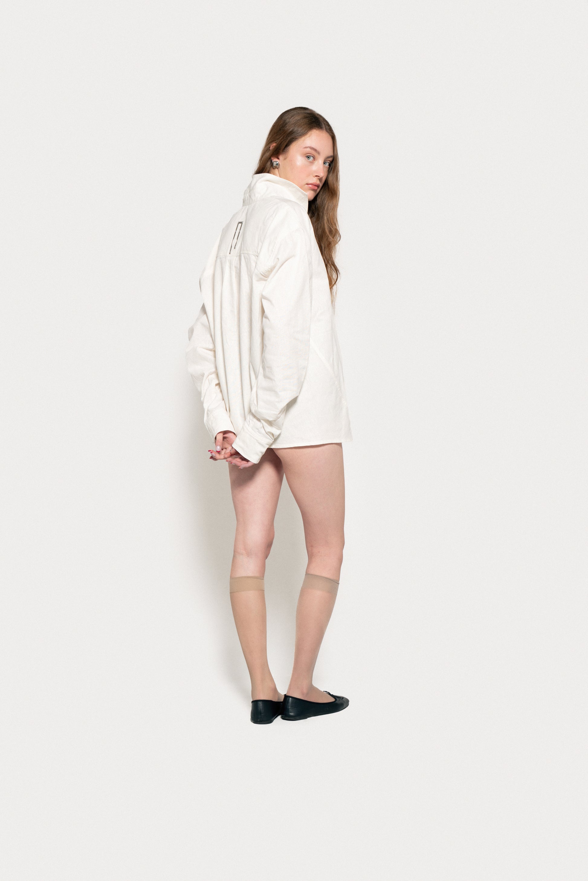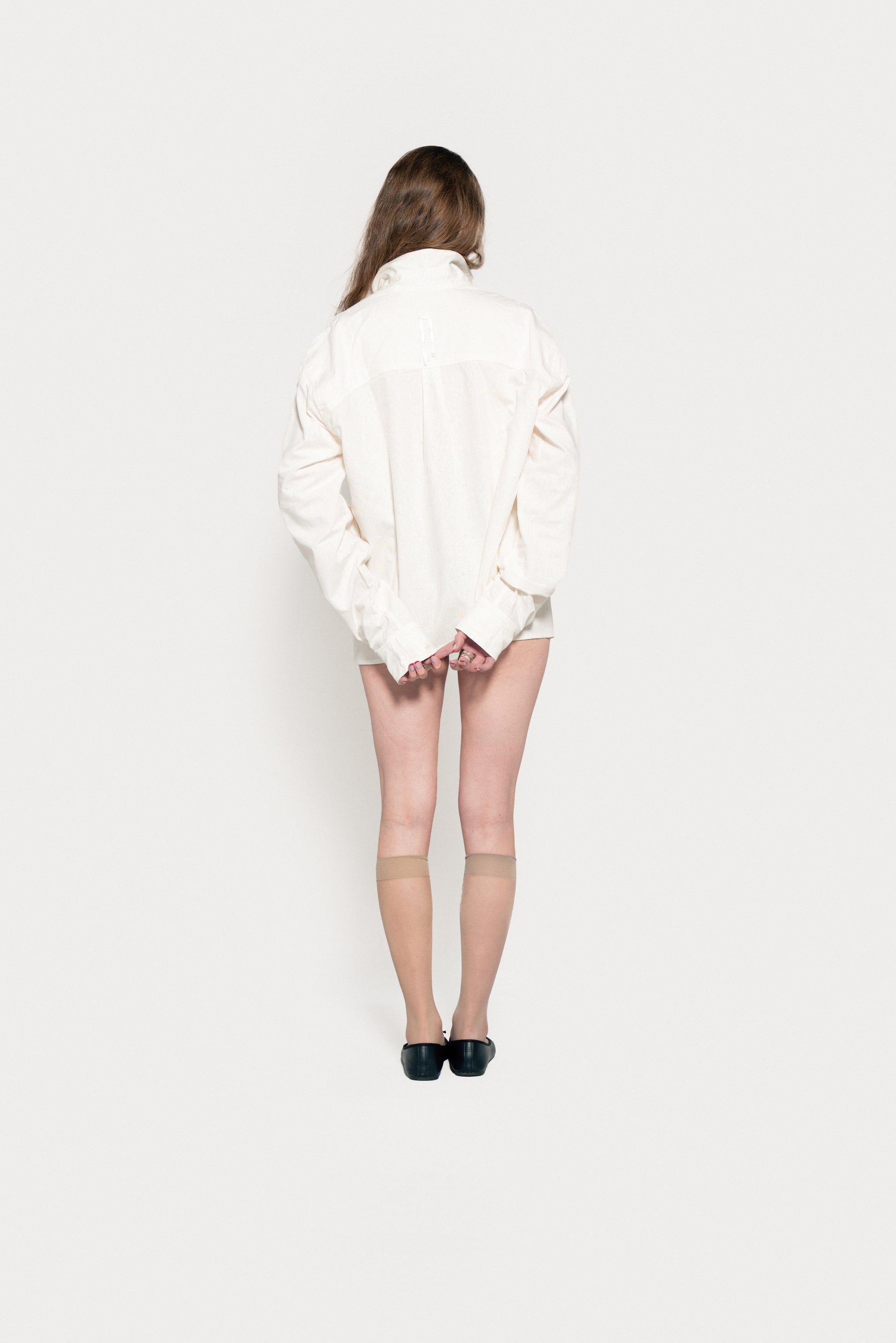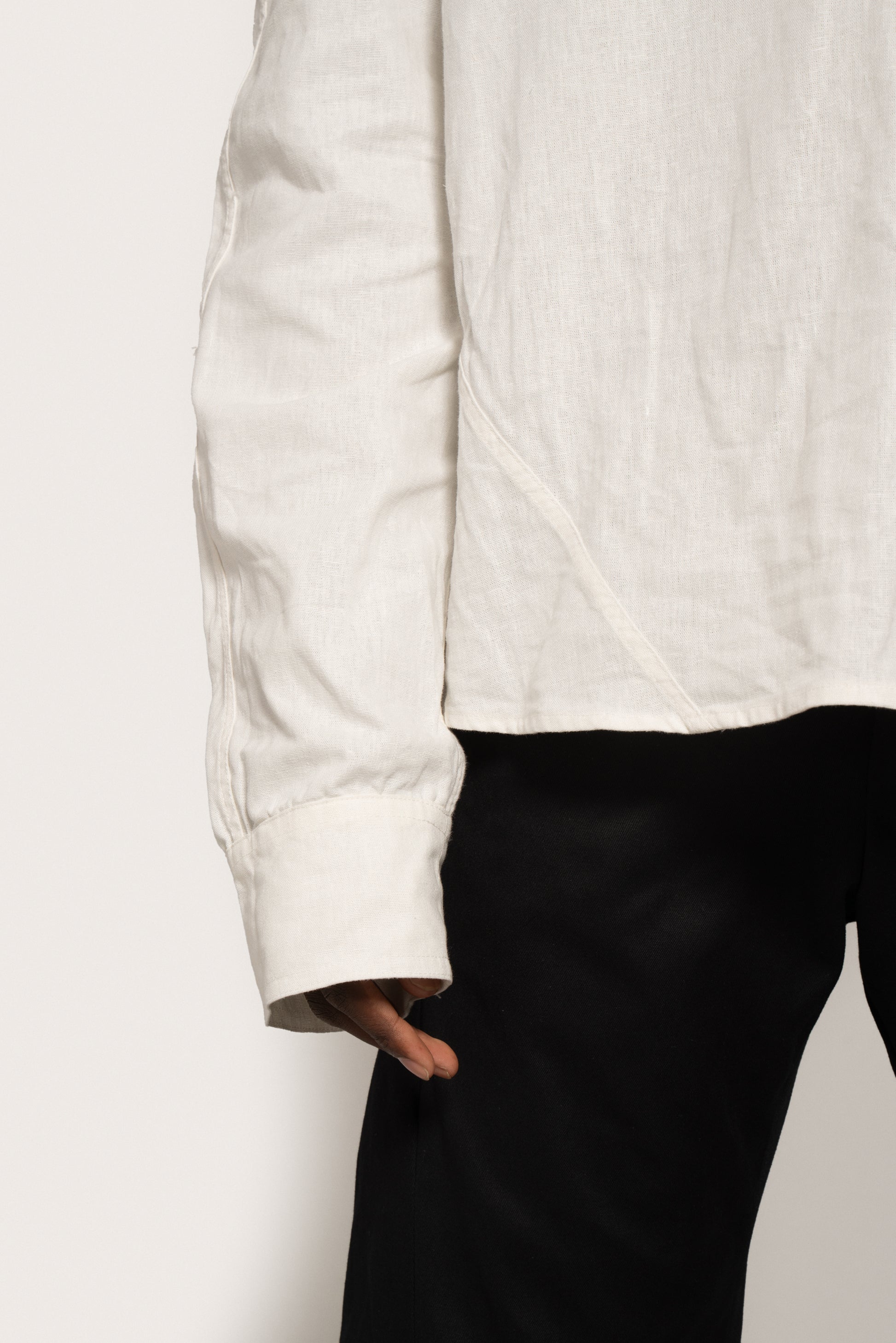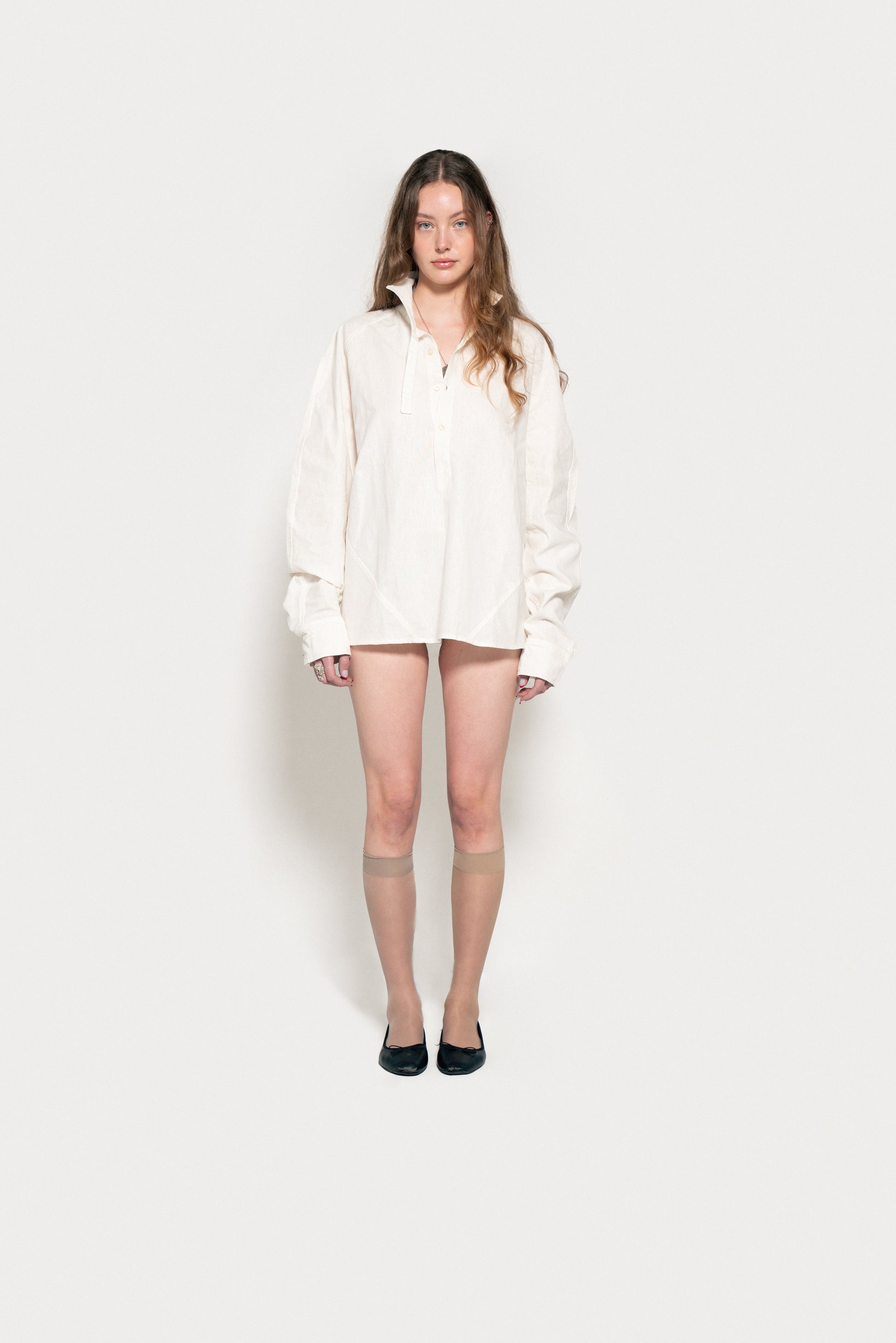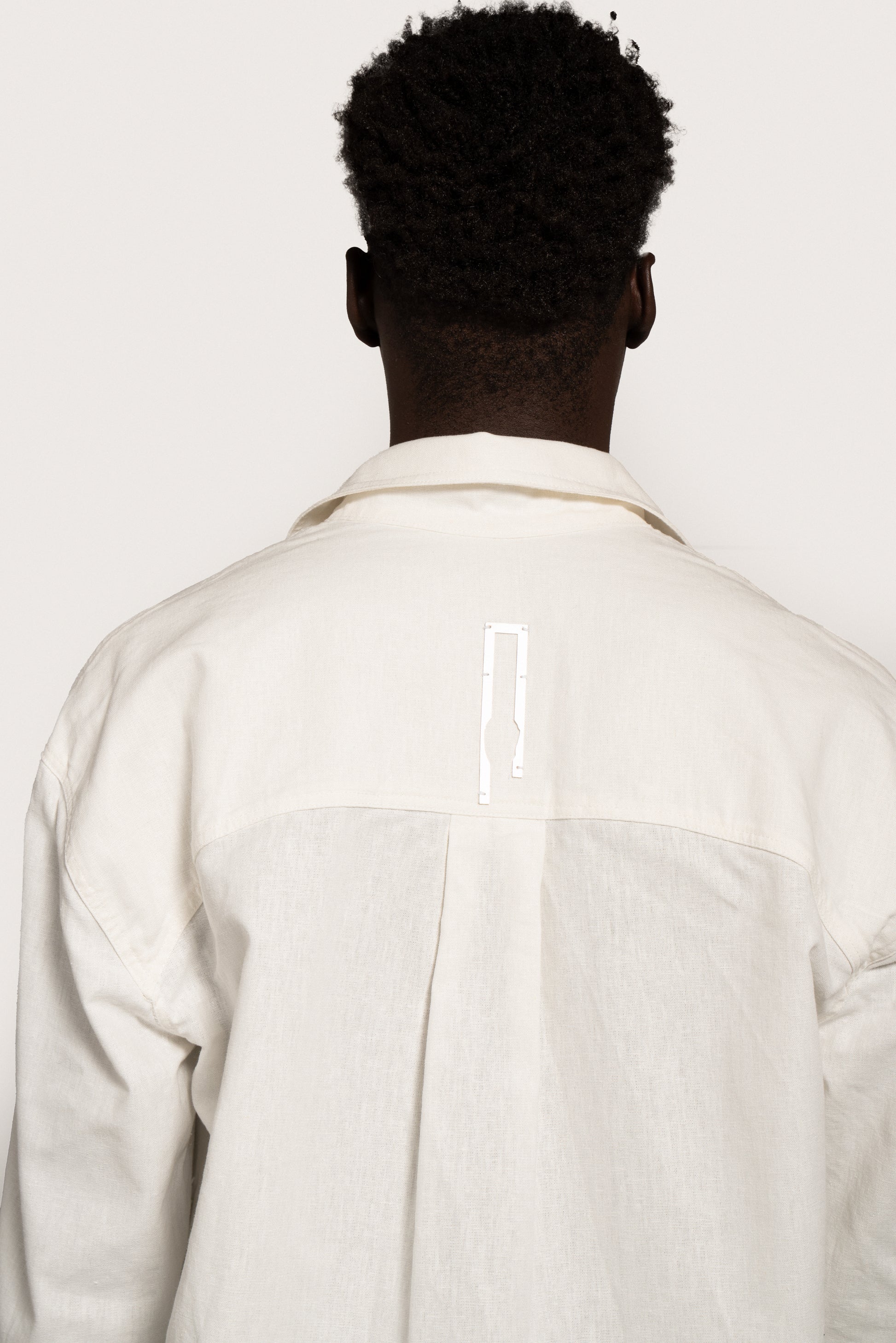 Loose-fitting, straight-cut linen and cotton shirt. It features a raglan cut at the front and a classic armhole at the back, accompanied by a yoke cut that blocks a pleat at the center back. Stainless steel plate on the back. Asymmetrical collar with three-button polo fastening at the center front. The right strap is extended to allow for different fastening options, while the left round neck has a loop that allows the strap to pass through. There are two buttonholes and two buttons at the bottom of the sleeve to adjust the width of the sleeve.