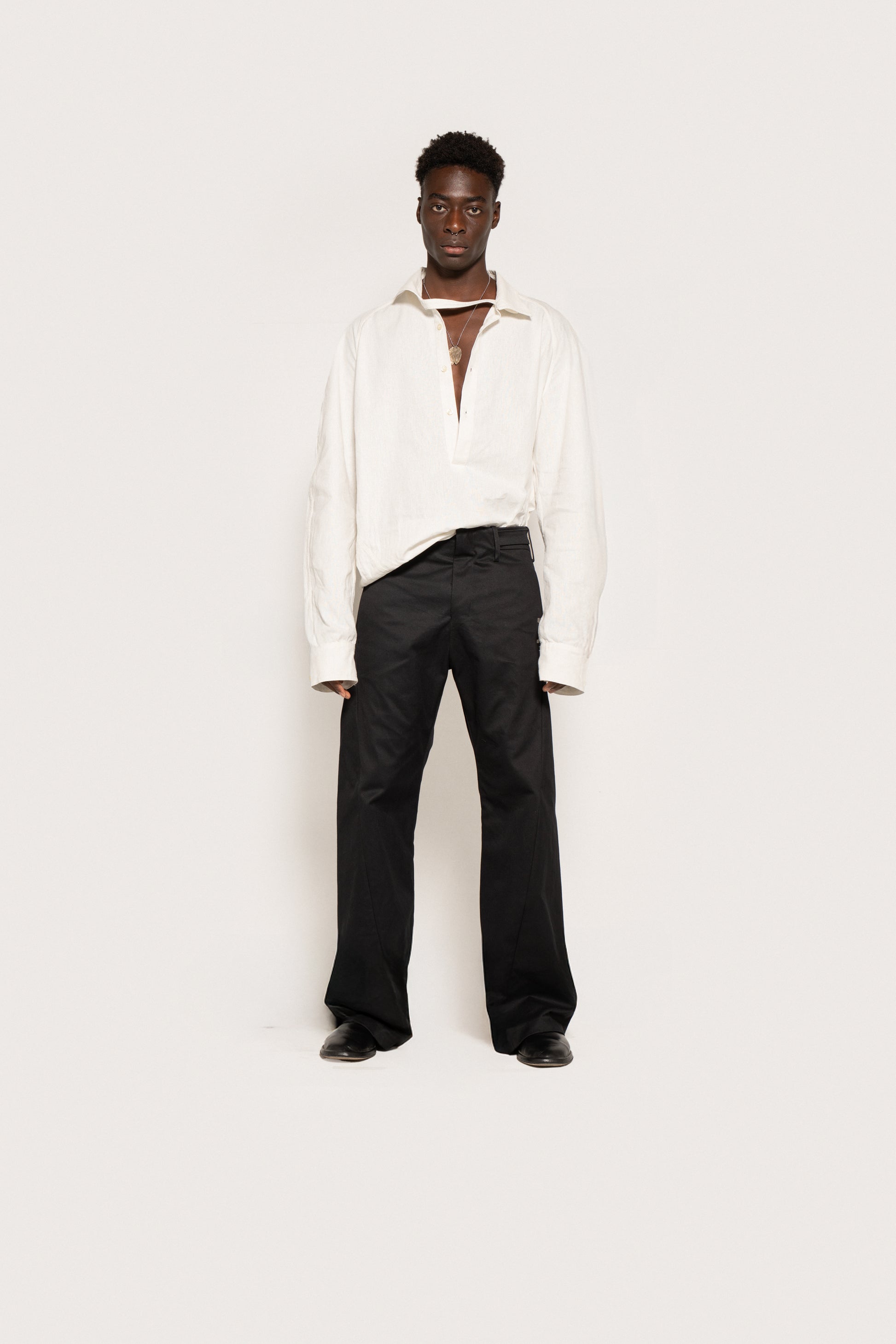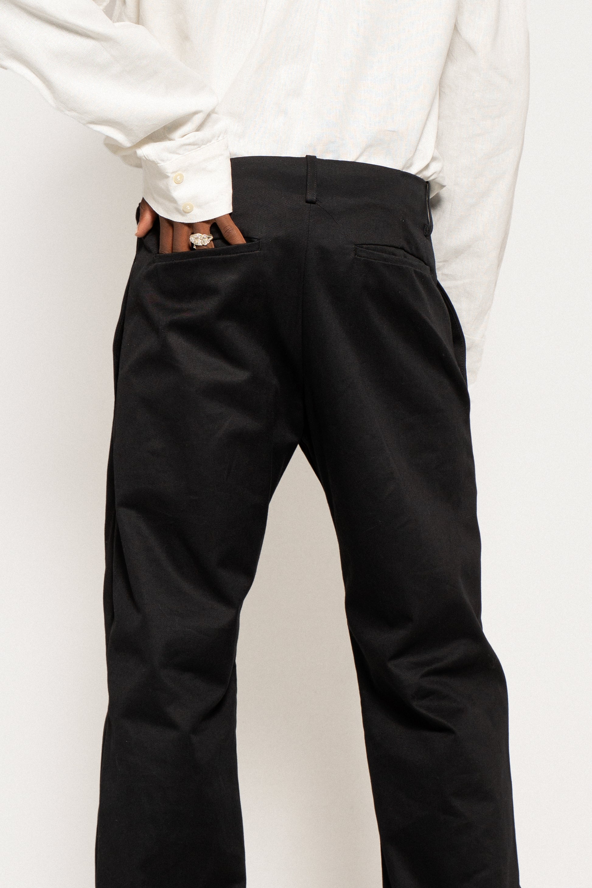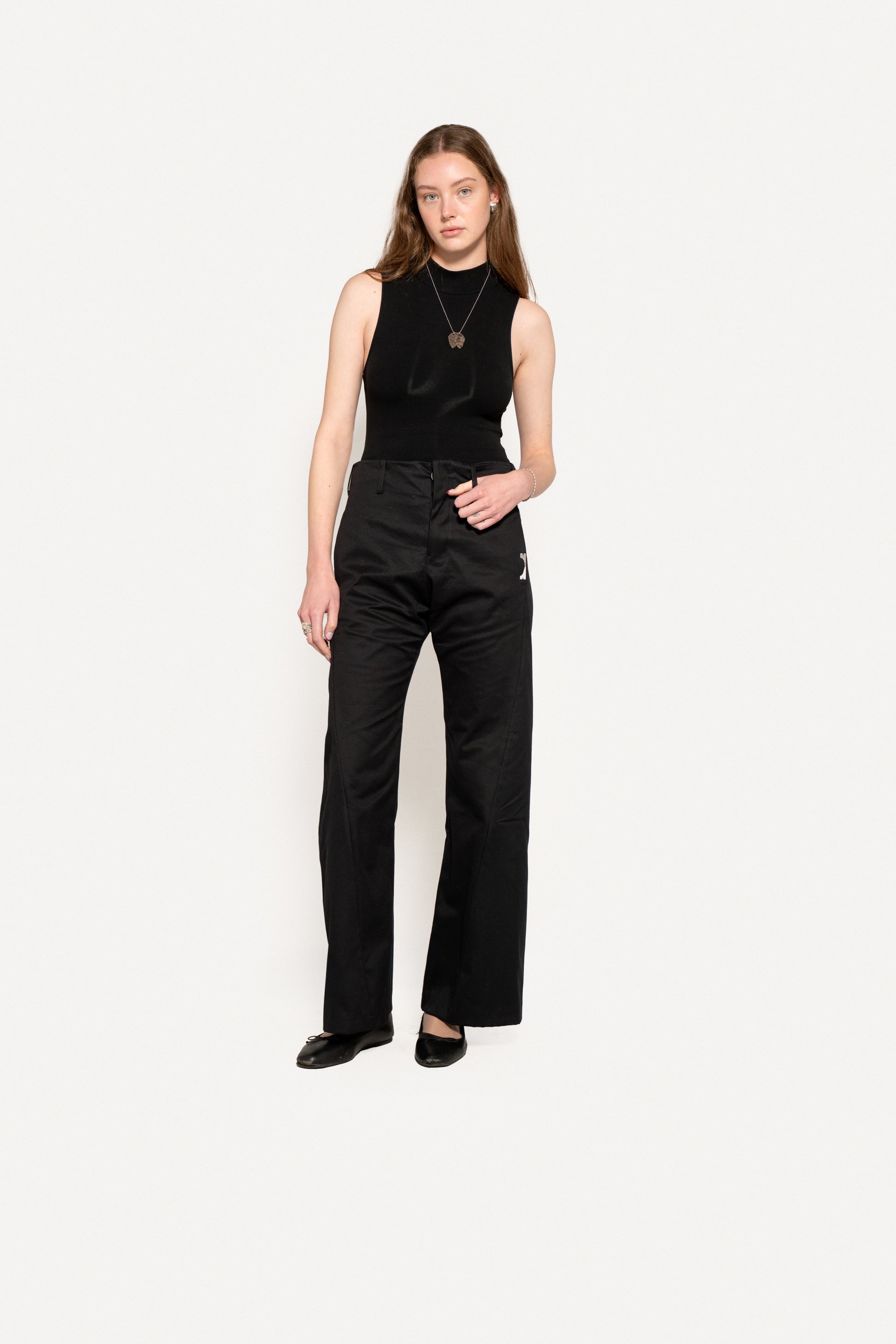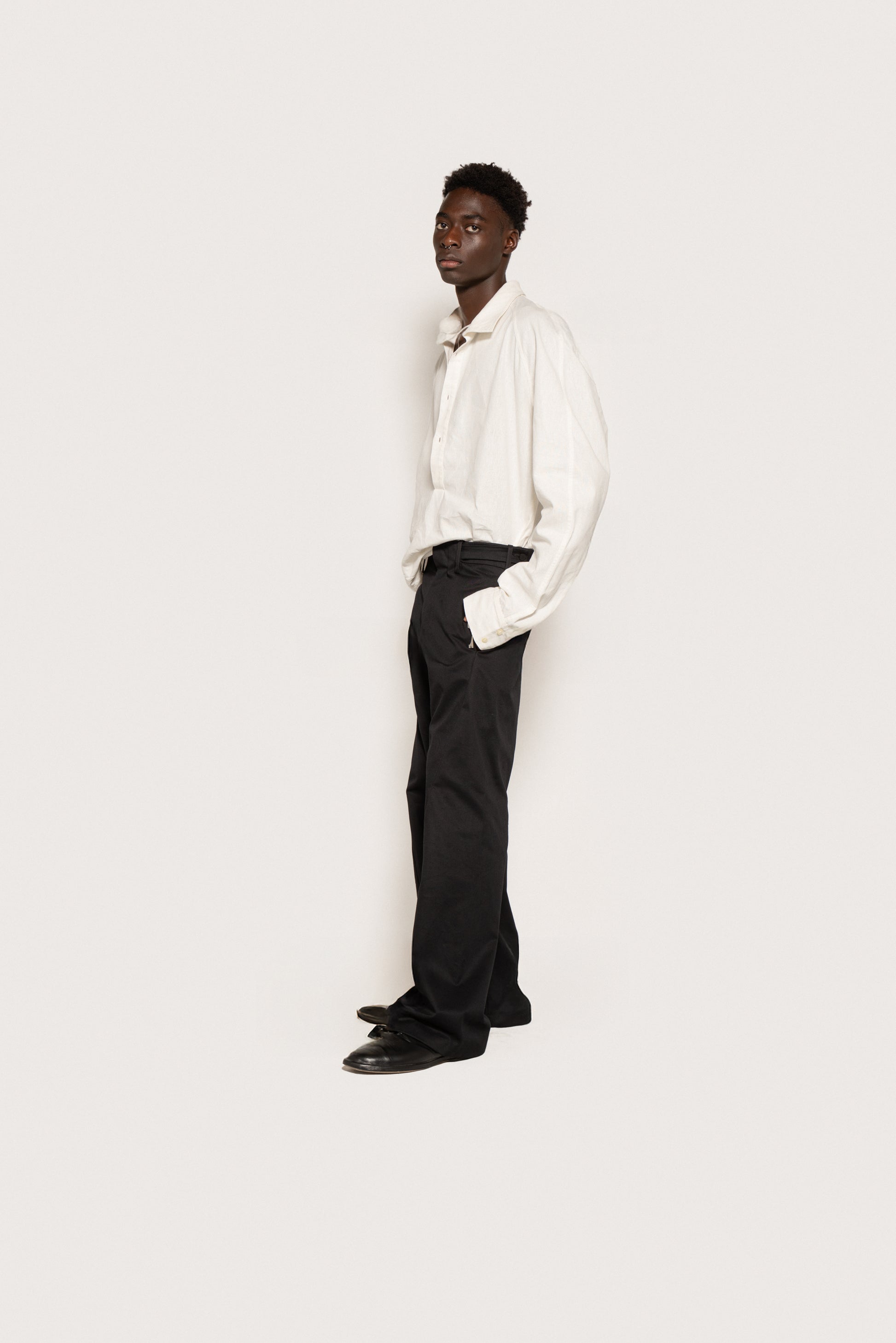 Cotton trousers with a regular fit, straight leg, and flared hem. The waistband features a strap that fastens at the back with a button. The trousers fasten with four concealed buttons. Four-pocket style, with back welt pockets and front pockets inserted into the side seam that continue down the center of the leg.