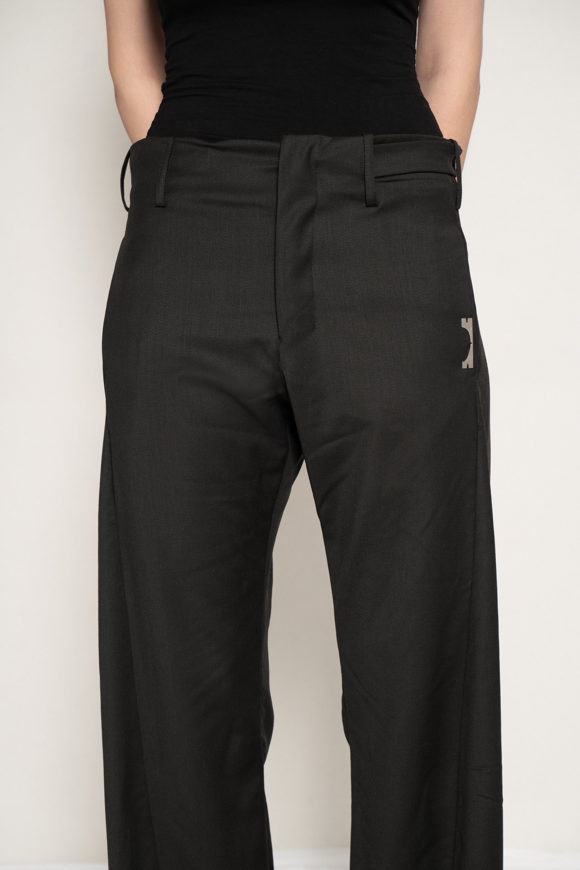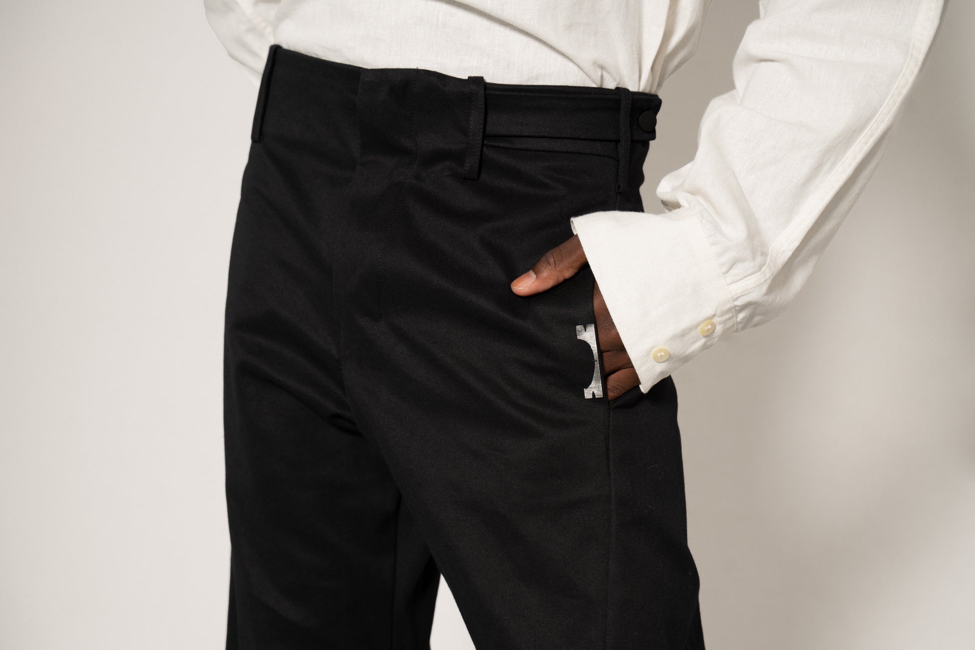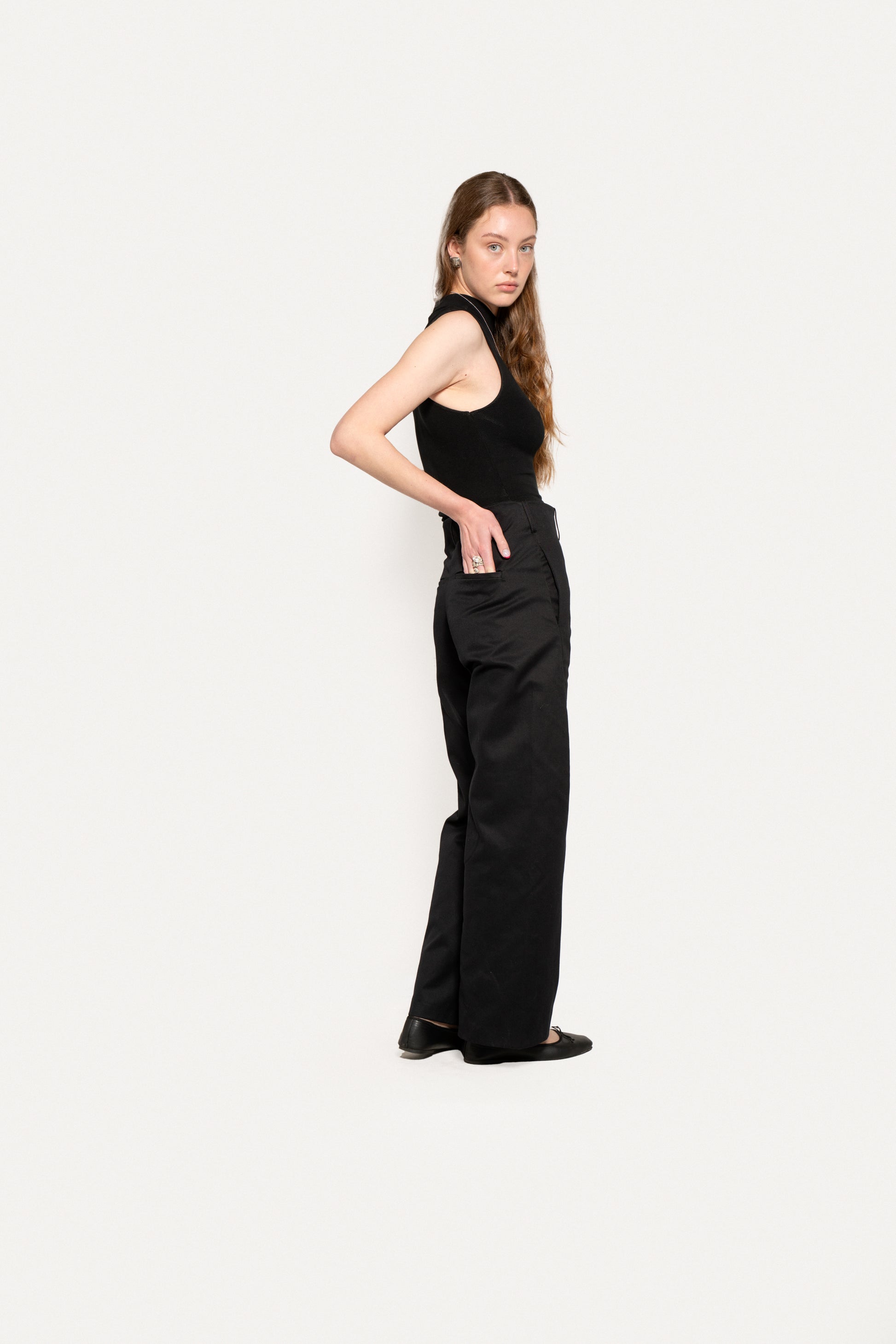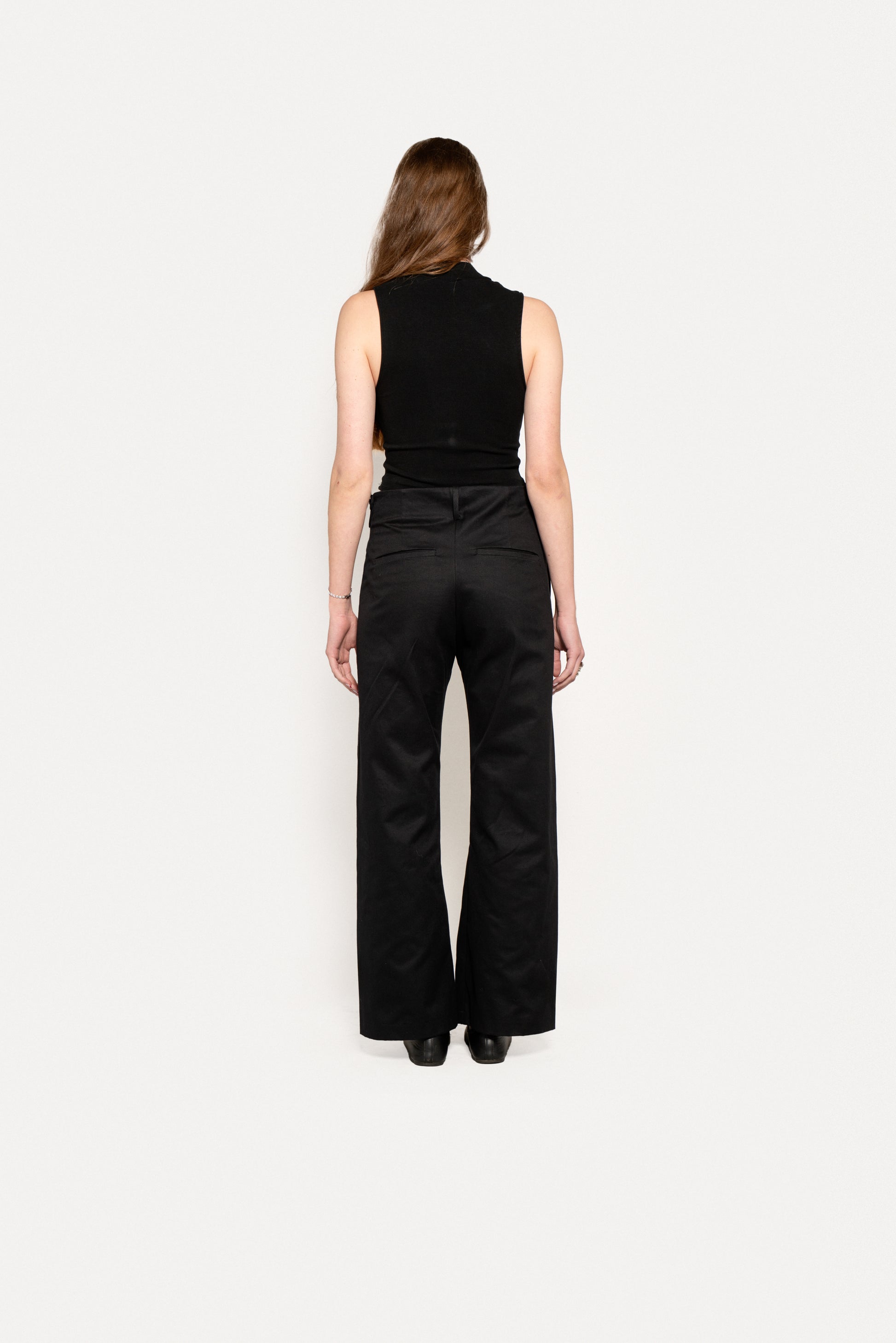 Cotton trousers with a regular fit, straight leg, and flared hem. The waistband features a strap that fastens at the back with a button. The trousers fasten with four concealed buttons. Four-pocket style, with back welt pockets and front pockets inserted into the side seam that continue down the center of the leg.