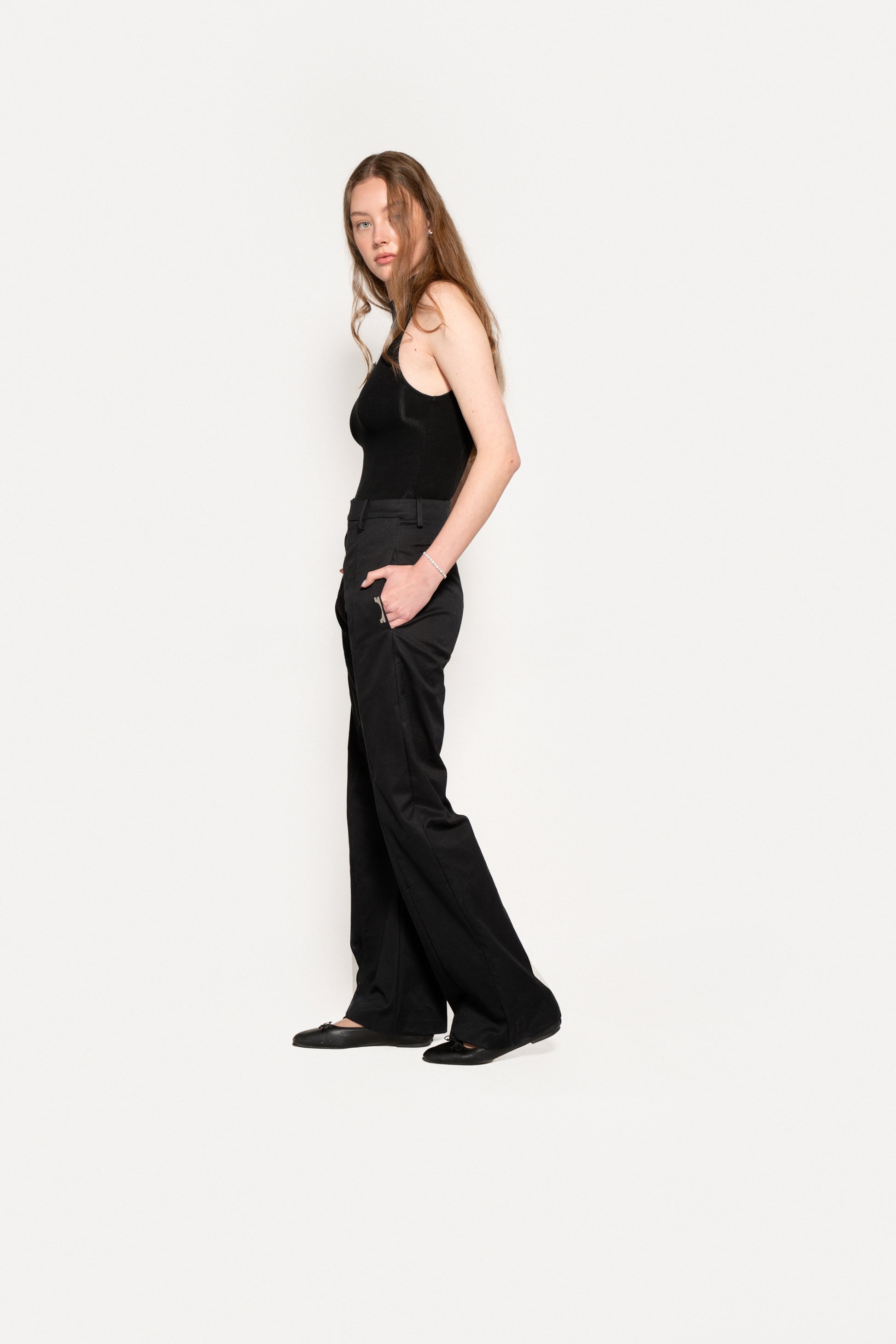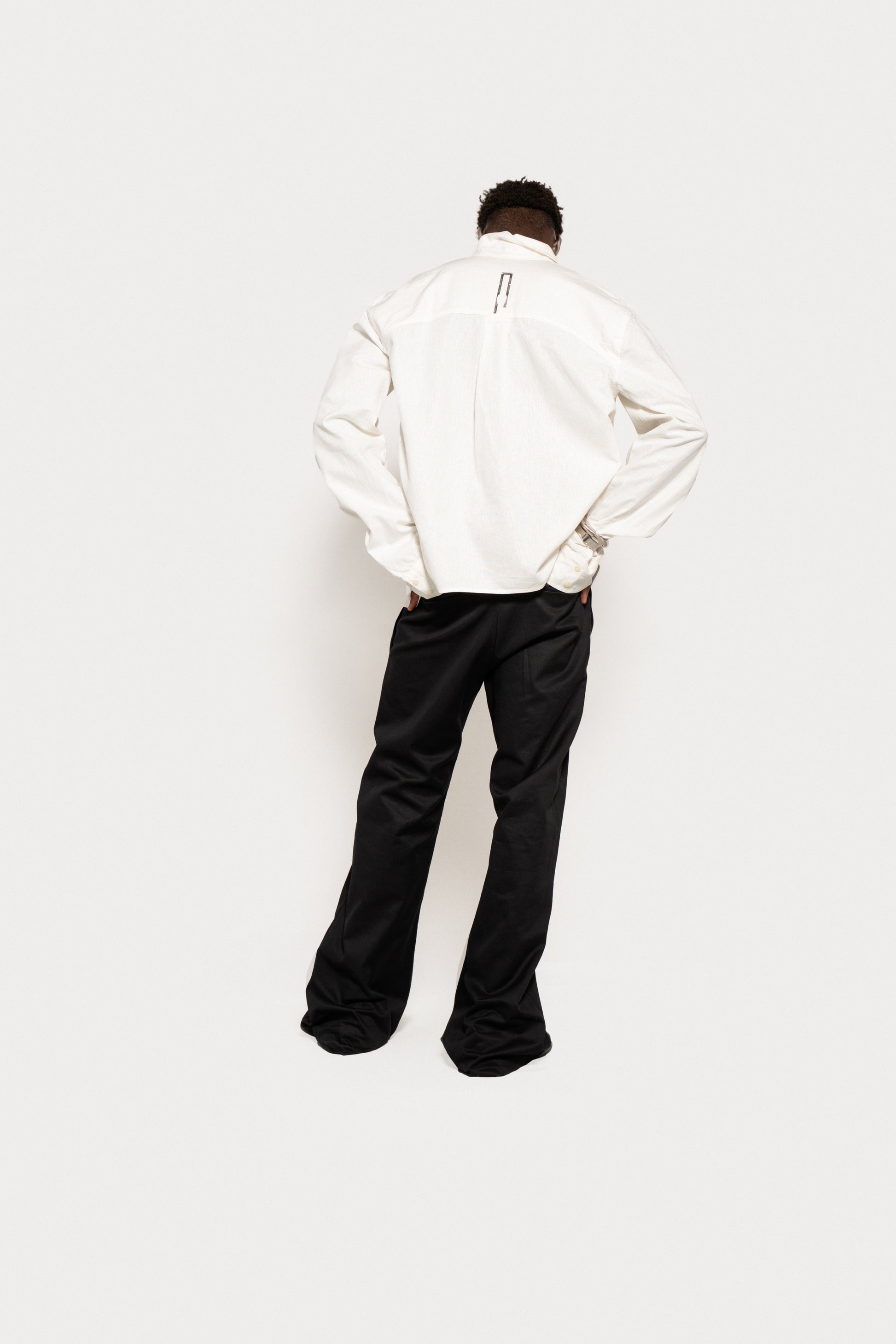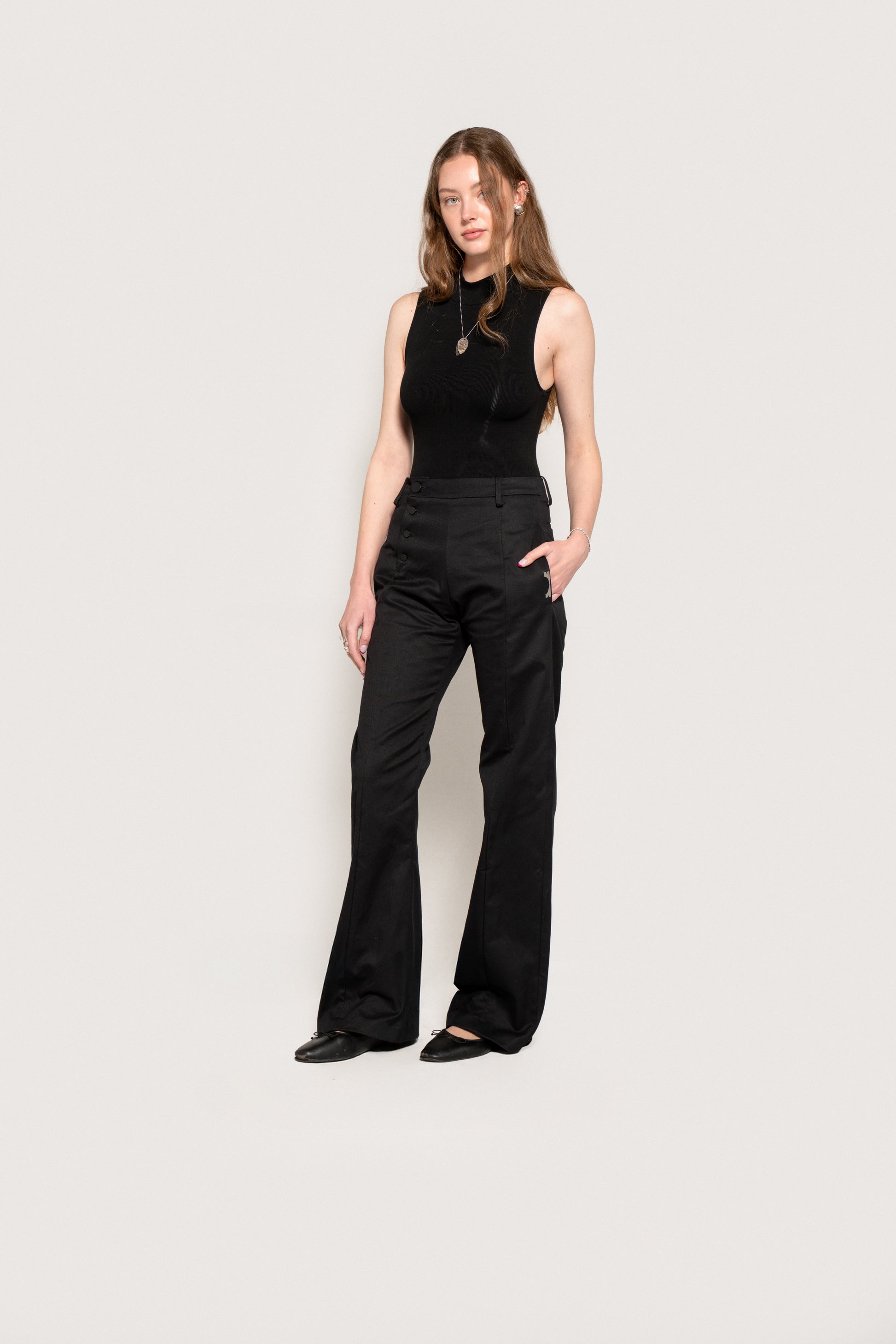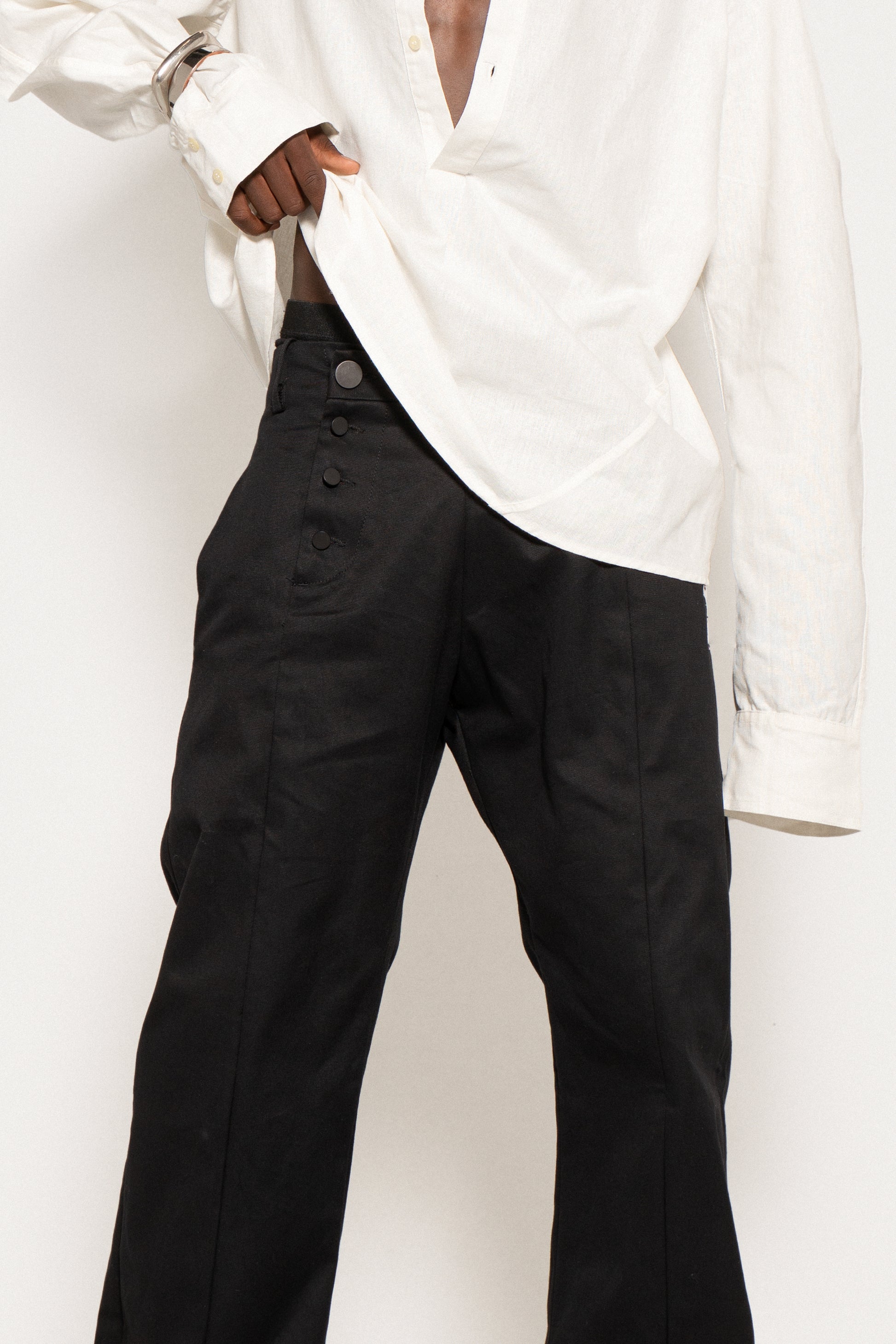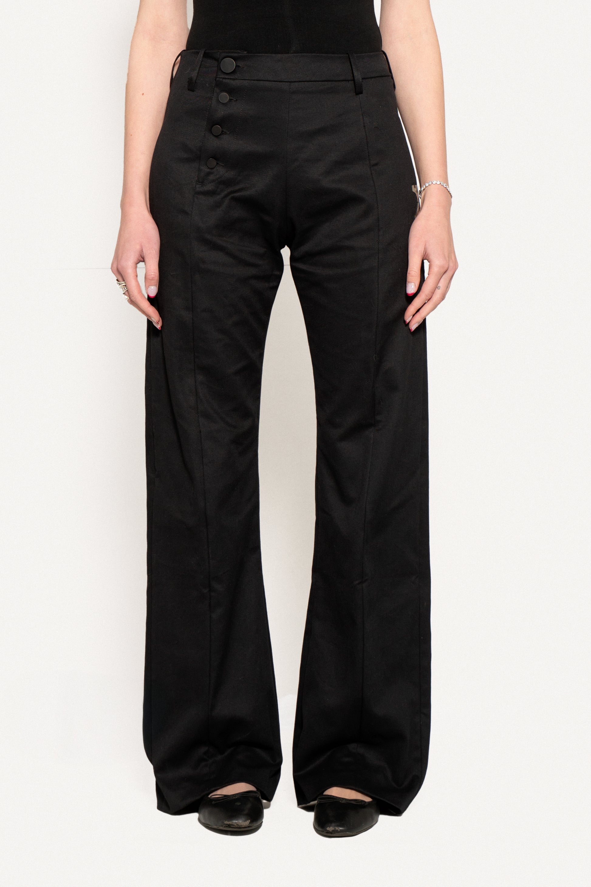 Regular fit cotton trousers with a straight cut and flared hem. Asymmetrical waist with a single horizontal cut on the left side. The closure is offset to the center of the right leg and consists of 4 visible buttons. There is a central cut on the front of both the right and left legs.